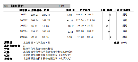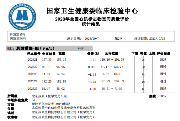 近日,國家衛(wèi)生健康委臨床檢驗(yàn)中心(NCCL)公布了2023年第二次全國臨床檢驗(yàn)室間質(zhì)量評(píng)價(jià)結(jié)果。經(jīng)了解,熱景生物心肌標(biāo)志物(肌酸激酶同工酶、肌紅蛋白、肌鈣蛋白I)、血清降鈣素原項(xiàng)目的上轉(zhuǎn)發(fā)光及化學(xué)發(fā)光兩大平臺(tái)產(chǎn)品,以及D-二聚體、白介素6、胃蛋白酶原項(xiàng)目的化學(xué)發(fā)光平臺(tái)產(chǎn)品均滿分通過此次室間質(zhì)量評(píng)價(jià)。同時(shí),熱景生物參與的上海臨床檢驗(yàn)中心2023年第二次能力驗(yàn)證活動(dòng),包括AFP異質(zhì)體比率、B型鈉尿肽/N末端B型鈉尿肽前體、心肌標(biāo)志物(肌酸激酶同工酶、肌紅蛋白、肌鈣蛋白I)、血清降鈣素原等項(xiàng)目在內(nèi)的產(chǎn)品均通過評(píng)價(jià)。