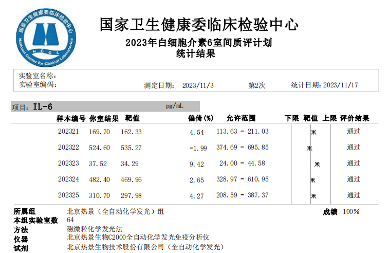臨床檢驗(yàn)中心室間質(zhì)量評(píng)價(jià)的結(jié)果可以反映出實(shí)驗(yàn)室管理水平和檢測結(jié)果的準(zhǔn)確性、可靠性和穩(wěn)定性,而準(zhǔn)確可靠的檢測結(jié)果對(duì)患者的疾病診斷、治療和預(yù)后判斷都會(huì)產(chǎn)生直接影響。此次國家衛(wèi)生健康委臨床檢驗(yàn)中心和上海臨床檢驗(yàn)中心組織的室間質(zhì)評(píng)活動(dòng)均通過質(zhì)量評(píng)價(jià),充分彰顯了熱景生物強(qiáng)大的產(chǎn)品以及技術(shù)實(shí)力。