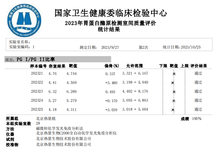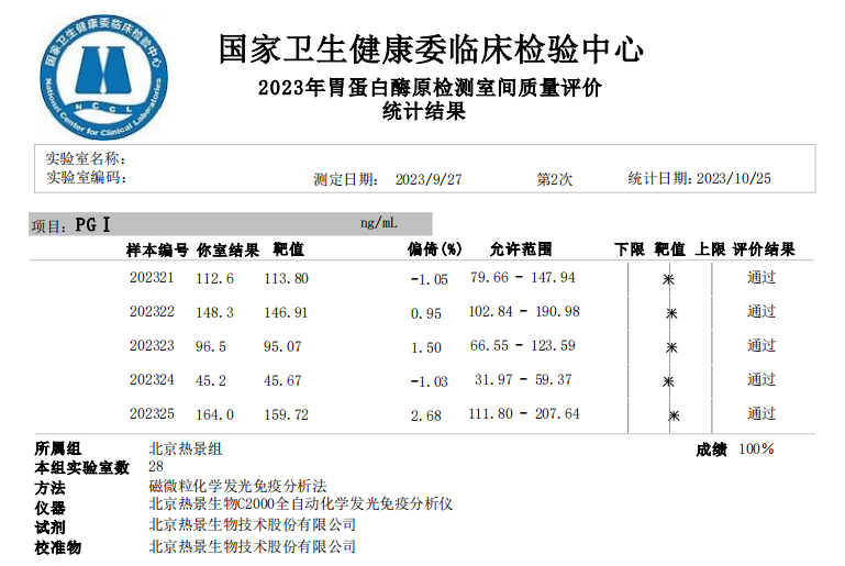 胃蛋白酶原(PGI、PGII、PGI/PGII比率)室間質(zhì)評(píng)成績單