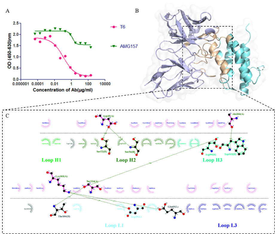 圖1:TSLP-T6復(fù)合物結(jié)構(gòu)分析。(A) ELISA實(shí)驗(yàn)測定AMG157與T6抗體的結(jié)合表位;(B) TSLP-T6復(fù)合物結(jié)構(gòu);(C) TSLP-T6作用力分析