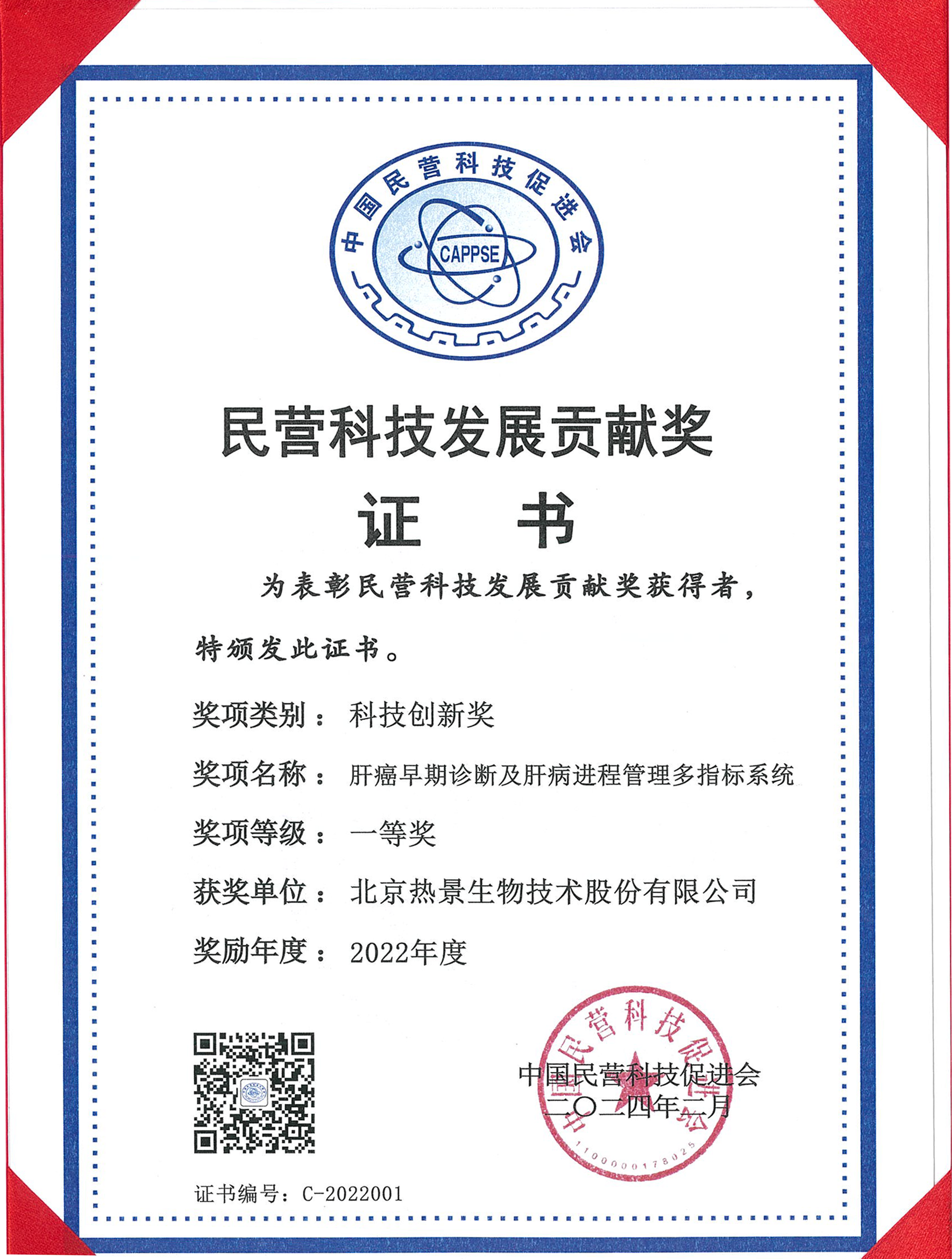 近日,中國民營科技促進(jìn)會(huì)公布了“2022年度民營科技發(fā)展貢獻(xiàn)獎(jiǎng)”獲獎(jiǎng)企業(yè)名單,熱景生物“肝癌早期診斷及肝病進(jìn)程管理多指標(biāo)系統(tǒng)”項(xiàng)目榮獲“2022年度民營科技發(fā)展貢獻(xiàn)獎(jiǎng)”科技創(chuàng)新一等獎(jiǎng)。