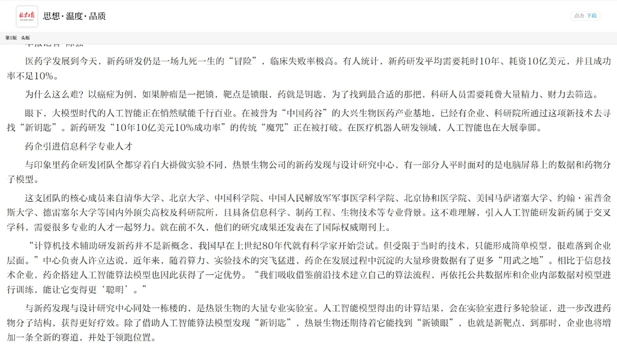 近期,人民日?qǐng)?bào)、新華社、經(jīng)濟(jì)日?qǐng)?bào)、中國(guó)外文局、北京日?qǐng)?bào)等多家媒體先后走訪熱景生物,通過(guò)報(bào)道國(guó)際先進(jìn)創(chuàng)新抗體藥物研發(fā)前行者——舜景醫(yī)藥、X-Gen AI新藥發(fā)現(xiàn)與設(shè)計(jì)研究中心最新研發(fā)管線進(jìn)展、學(xué)術(shù)成果等實(shí)踐案例,進(jìn)一步揭開(kāi)AI加速FIC抗體藥物研發(fā)神秘面紗,探索人工智能技術(shù)如何打破藥物研發(fā)“雙十定律”。
