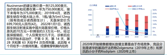 Nusinersen(諾西那生鈉):2016年首次上市,由Ionis研發(fā),是一種反義寡核苷酸(ASO),諾西那生鈉注射液可以改變SMN2前mRNA的剪接,從而增加完整長度SMN蛋白的產(chǎn)生。2019年中國獲批上市,且于2021年納入國家醫(yī)保目錄。諾西那生鈉可用于出生3天的嬰兒到80歲的老人,適用人群非常廣泛。截止到2021年,全球有11000人使用過諾西那生鈉。