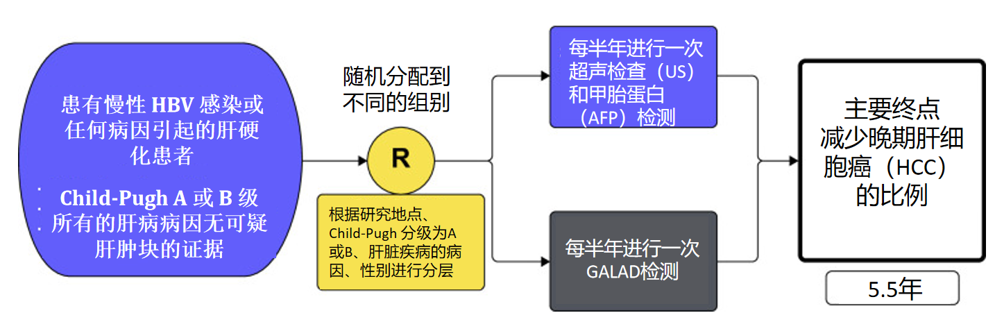 為了驗證GALAD模型在真實世界中的臨床應(yīng)用效果,美國國家癌癥研究所(NCI)牽頭開展了TRACER試驗。TRACER 研究是一項實用的隨機 IV 期試驗,旨在比較基于超聲的篩查與生物標(biāo)志物組合 GALAD 在患有慢性 HBV 感染或任何病因引起的肝硬化患者中的應(yīng)用。簡而言之,5500 名患者以 1:1 的方式隨機分配到 A 組,建議每半年進行一次超聲 ± AFP 篩查,或 B 組,建議每半年進行一次 GALAD 篩查。按地點、Child-Pugh 分級(A 與 B)、肝病病因(病毒性、非病毒性和非肝硬化性 HBV 感染)和性別進行隨機分層。通過對比兩組的結(jié)果,研究人員希望能夠確定哪種方法能更好地減少晚期肝癌的發(fā)現(xiàn)率,并改善患者的治療效果。