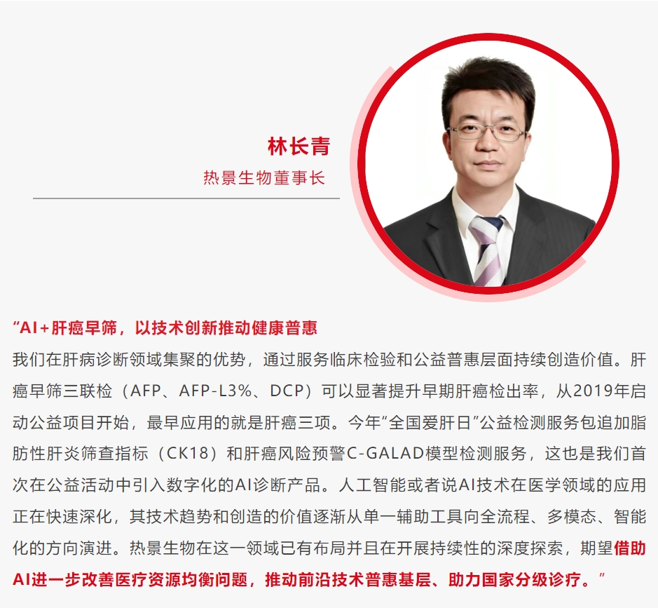 3月18日,值第25個(gè)“全國愛肝日”期間,“2025肝癌防治健康中國行——全國愛肝日”大型公益義診活動(dòng)在全國30省份近百家醫(yī)院的協(xié)同下聯(lián)合展開,惠及近萬人次,公益健康服務(wù)包(肝癌三項(xiàng)、GP73、CK18-M30/M65等)由熱景生物支持。2025年升級版“肝病全周期健康檢測服務(wù)包”首次融合數(shù)智化AI診斷模型,探索“AI+創(chuàng)新診療”公益新模式,通過智能算法提升肝癌篩查效益,助力實(shí)現(xiàn)"篩查-診斷-干預(yù)"全流程精準(zhǔn)管理,全面推動(dòng)肝癌防治邁入數(shù)智化新階段。