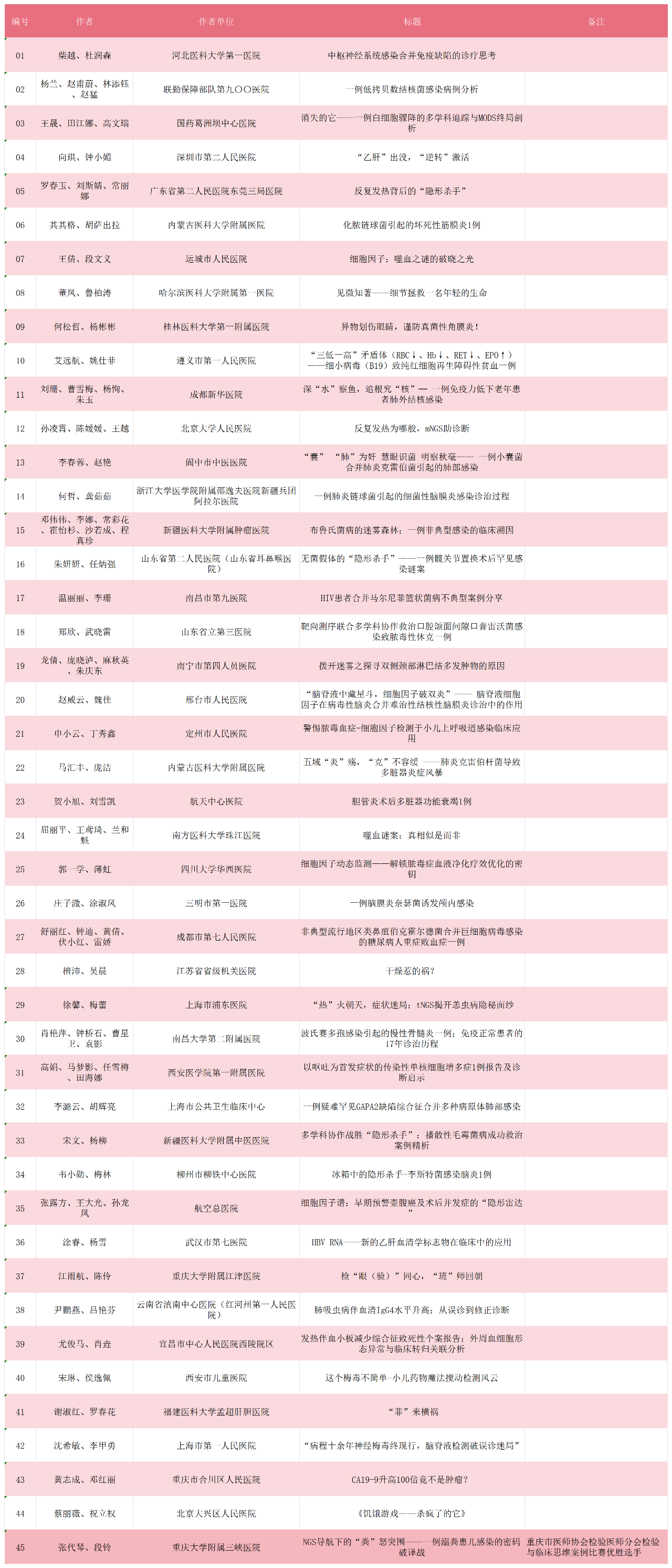為了有效推動(dòng)檢驗(yàn)與臨床的深度融合,進(jìn)一步提升檢驗(yàn)人員的臨床思維能力,在中華醫(yī)學(xué)會(huì)檢驗(yàn)醫(yī)學(xué)分會(huì)青年學(xué)組指導(dǎo)下,西部數(shù)智醫(yī)療研究院、《檢驗(yàn)醫(yī)學(xué)》雜志、檢驗(yàn)醫(yī)學(xué)新媒體主辦,白求恩精神研究會(huì)檢驗(yàn)醫(yī)學(xué)分會(huì)細(xì)胞因子與疾病檢測(cè)學(xué)組、北京熱景生物技術(shù)股份有限公司協(xié)辦的「第五屆檢驗(yàn)與臨床(感染性疾病)思維案例展示活動(dòng)」已全面啟動(dòng)。在面向全國進(jìn)行征稿,并對(duì)稿件進(jìn)行雙盲雙審(同一篇稿件均由2位專家進(jìn)行評(píng)審)后,根據(jù)評(píng)審結(jié)果,共納入復(fù)審稿件45篇。以下為詳細(xì)名單,排名不分先后。